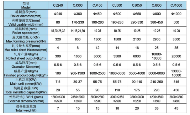 CJ系列干法輥壓造粒機是采用干法擠壓工藝技術,對含水量<10%的粉狀物料進行壓縮成片,再經過破碎、整粒、篩分工藝,使片塊狀物料變成符合使用要求的顆粒狀物料。干法輥壓造粒主要是靠外部加壓方式,使物料強制通過兩個相對旋轉的輥輪間隙,壓縮成片。在輥壓過程中,物料的實際密度能增大1.5-3倍,從而達到一定的強度要求。